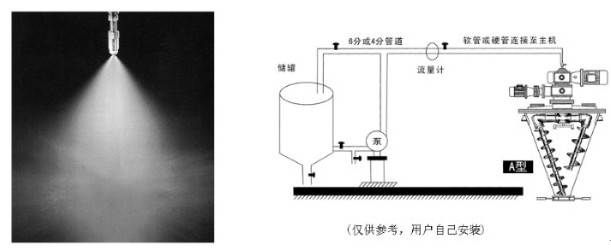 混合過程中需要添加液體時,液體由旋轉接頭輸入,經過管路、噴頭、均勻噴灑在筒體內運動的物料中,見下圖,此裝置如需配套,外加價訂貨時說明。
